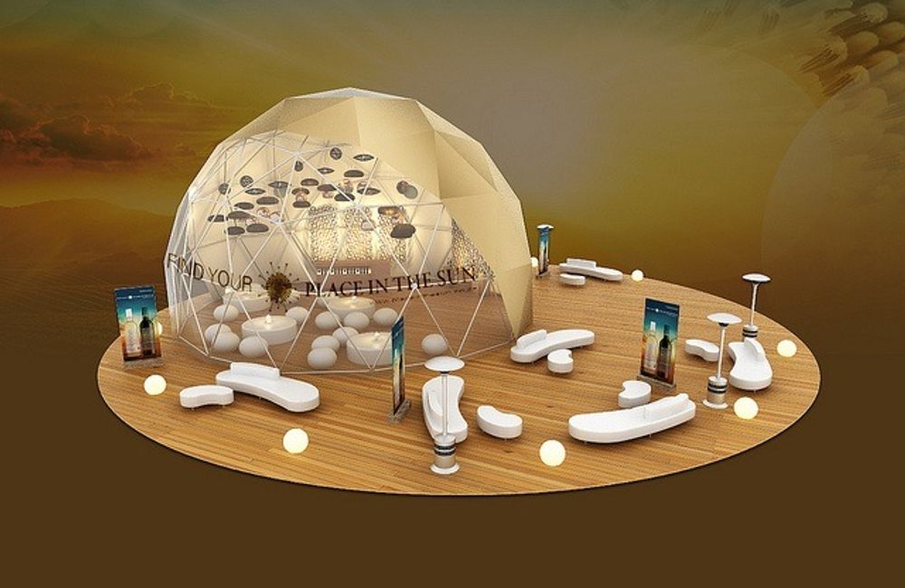 The idea was that people could experience the brand in a distinctive way tasting the range of varietals and taking it easy ‘under the sun’. We suggested a 7m geodesic dome structure, essentially a network of circles contributing towards the overall theme of a sun enriched interior and exterior. Balau decking at a 15m radius served as a base at floor level with tasting counters and display plinths in the dome, finished in distressed wood. White leather, arc shaped furniture, globe lighting and warm, attractive textures created shadows for the almost planetary space. Consumers could enjoy an exhilarating experience with an amazing philanthropic bearing.