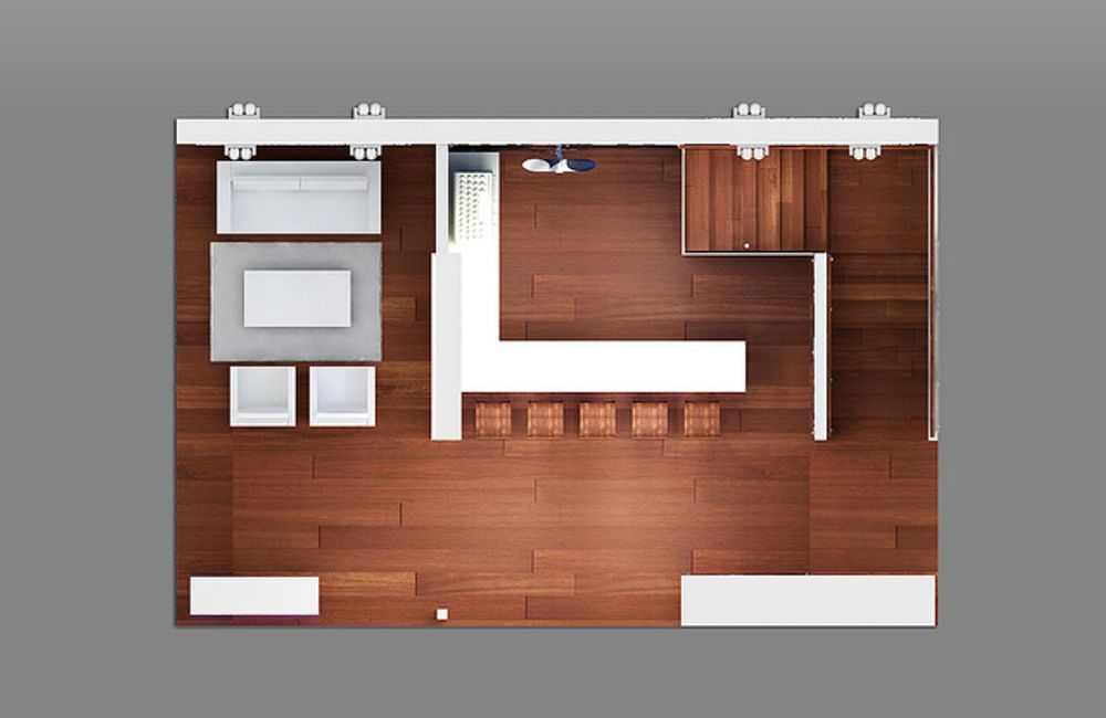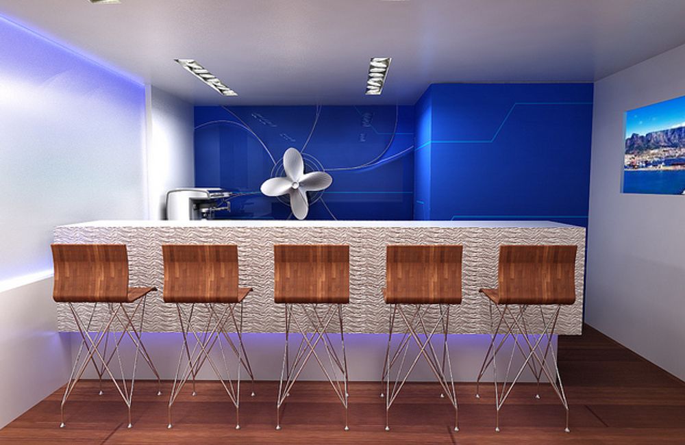The design provided a contemporary nautical theme with an upper and lower level. The floor treatment included laminate wood which served as a warm base to the crisp white structure. A welcome desk, lounge area and coffee bar could be found on the lower level. A real propellar was to be mounted to the back wall of the coffee bar serving as a talking point in competition with the recessed fish tank located on the opposite wall.